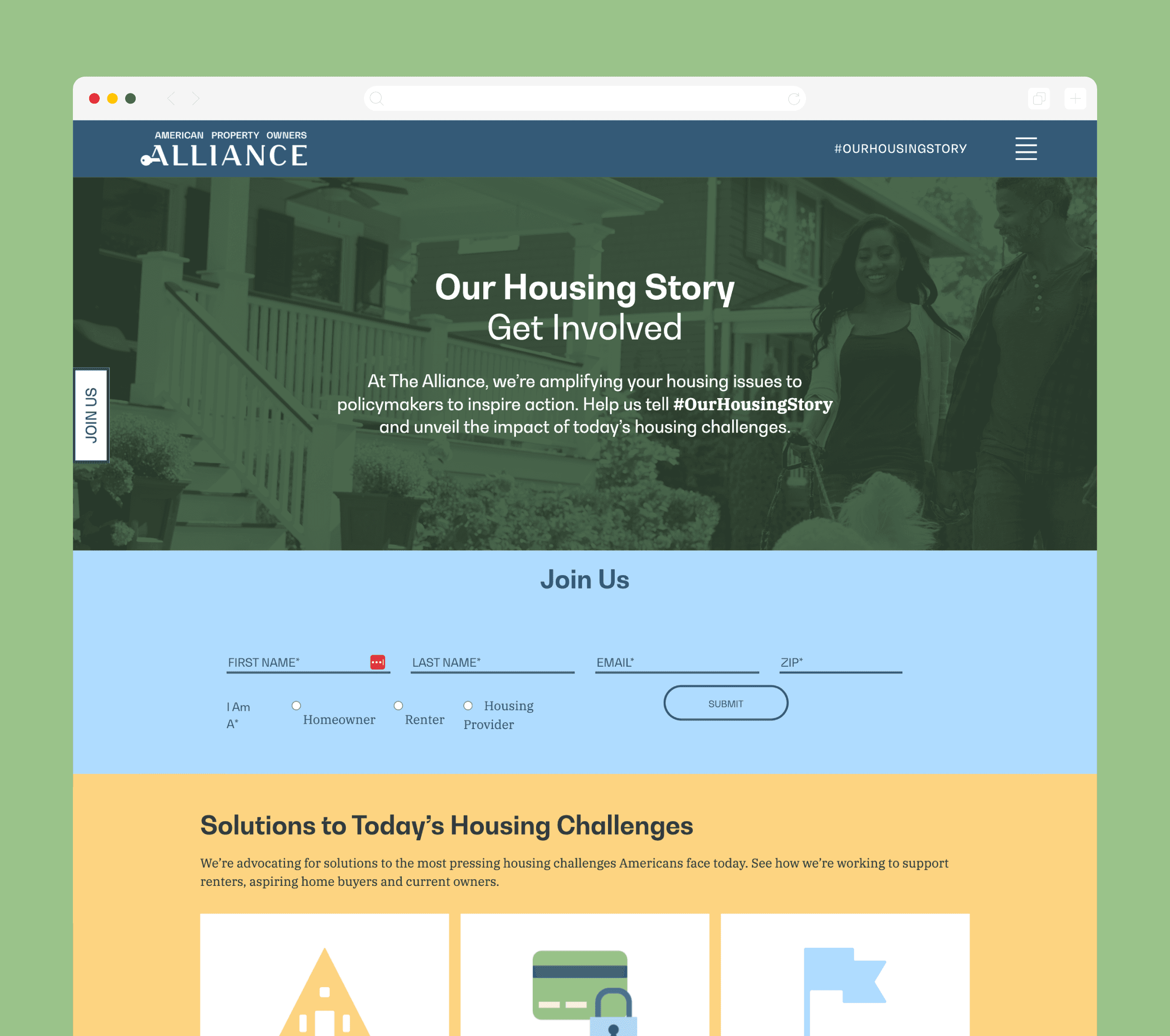Our challenge was to conceptualize, design, and launch a full campaign that felt human—not just data-driven. That’s where #OurHousingStory came in: a storytelling platform built to gather and highlight real experiences from voters, offering a more personal and emotional perspective on housing in America.