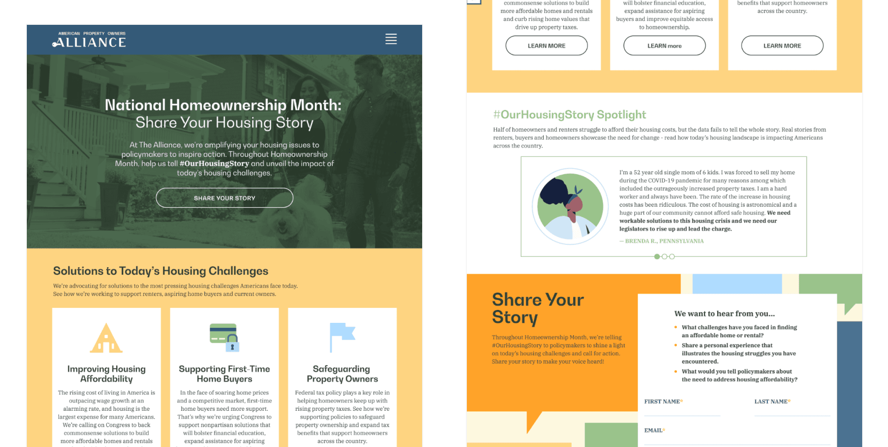The campaign highlighted stories from homeowners, renters, property owners, and future homeowners through paid social ads, display ads, and email marketing. By the end of the campaign, we collected 350+ voter stories.
