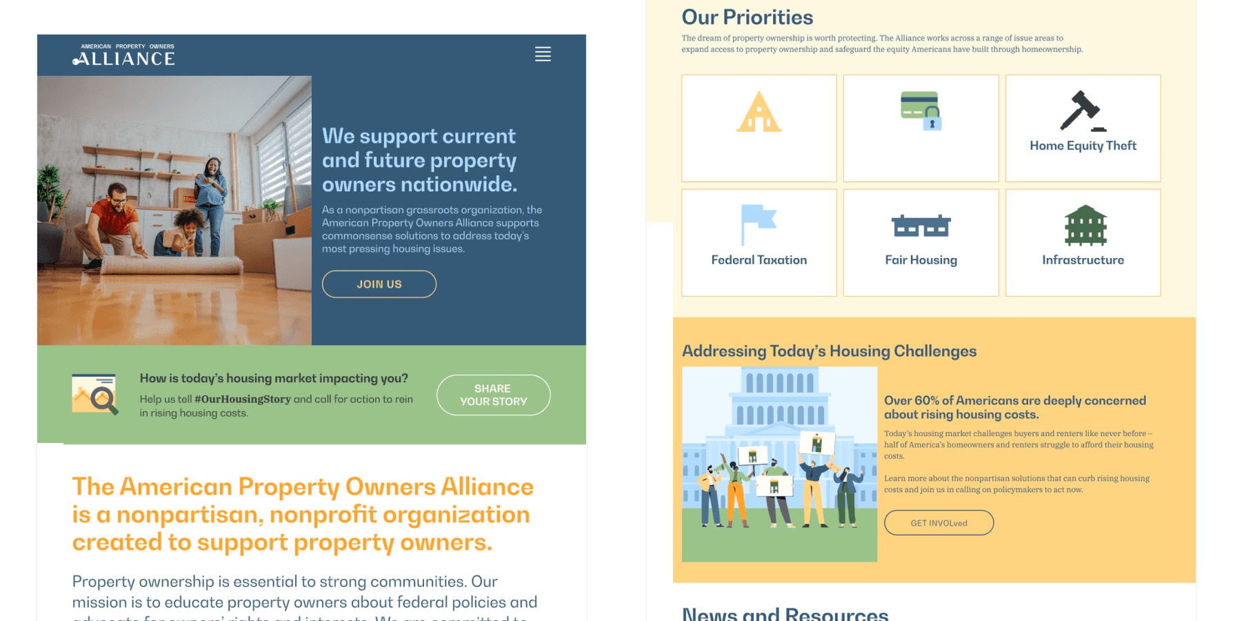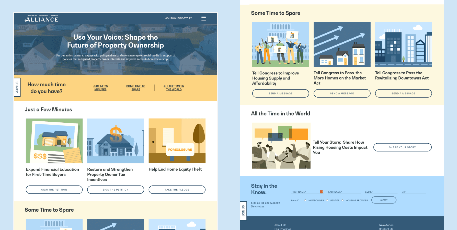 To solve this, I reorganized the content into clear, digestible sections based on how much time advocates were willing to spend learning about housing policy and taking action. I also introduced recognizable illustrations, strengthened the typographic hierarchy, and improved the page’s overall layout and easier for advocates to take meaningful action.